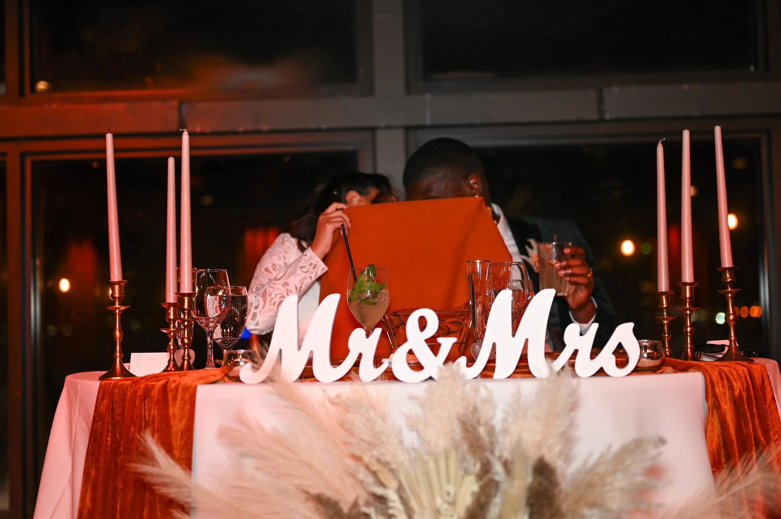 As the sun dipped lower, guests gathered for an elegant waterfront reception. The evening was adorned with stunning burnt orange florals and warm-toned decor that created an atmosphere both romantic and timeless. Laughter and music filled the air as loved ones toasted to Ashley and Anthony’s next chapter.